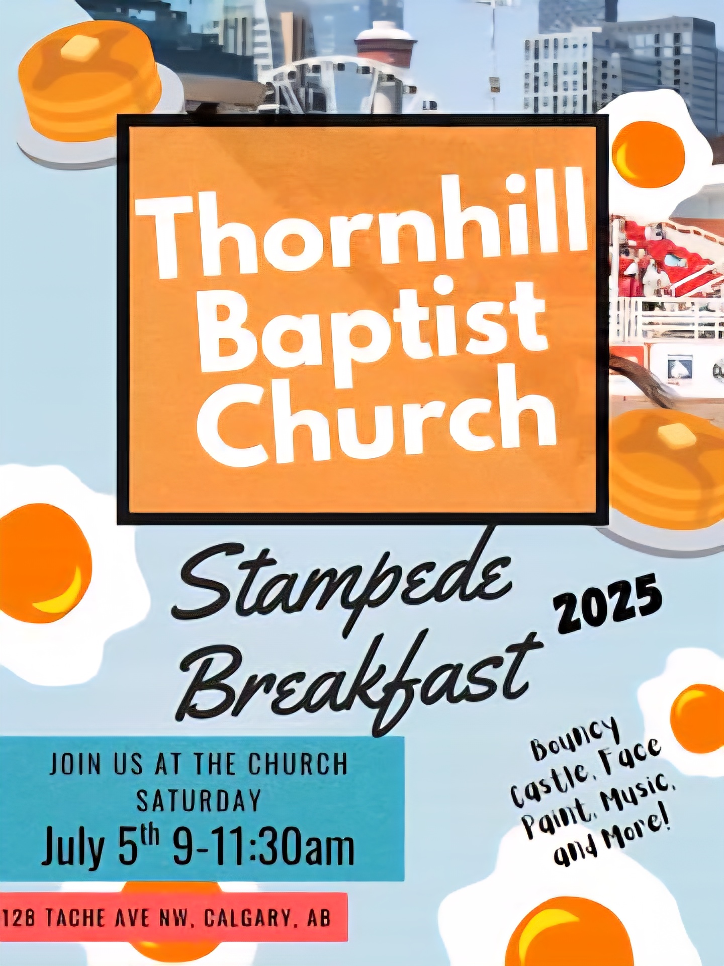 128 Tache Ave NW 128 Tache Ave NW, Calgary, Alberta, CanadaThornhill Baptist Church would like to invite you to join us for FREE Stampede Breakfast on July 5th from 9-11am. Everyone is Welcome 128 Tache Ave NW
