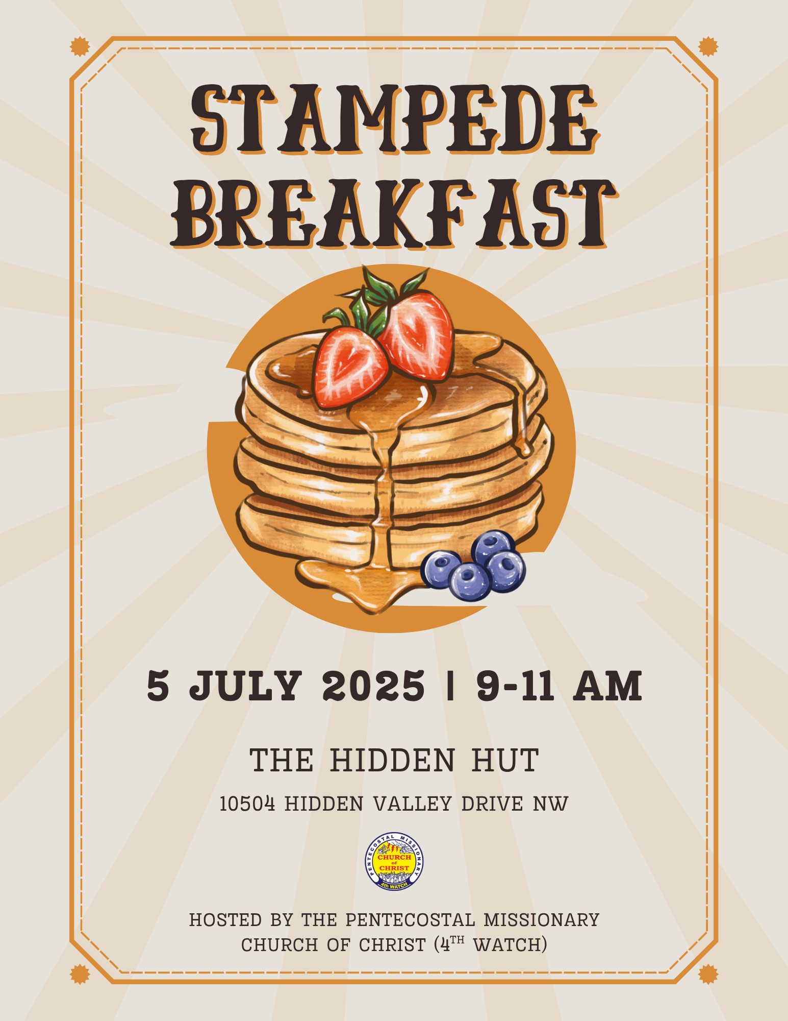 Hidden Valley Community Association 10504 Hidden Valley Dr. NW, Calgary, Alberta, CanadaSaddle up and join the festivities with the Pentecostal Missionary Church of Christ (4th Watch) for Stampede Breakfast! We’re excited to bring our community together for a morning of delicious food and entertainment. Come hungry and enjoy a hearty breakfast served with a smile. Bring your family and friends for a morning of laughter, fun […]