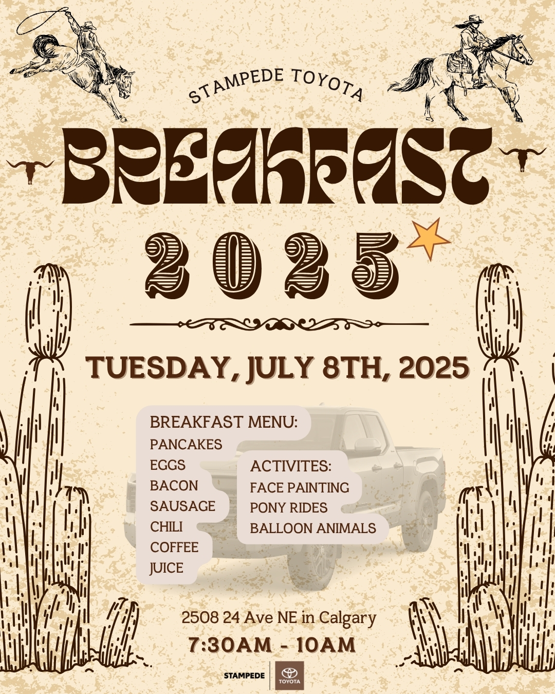 2508 24th Avenue NE Calgary, AB T1Y 6R8 2508 24th Avenue NE, CalgaryJoin us for our annual Stampede Toyota Pancake Breakfast! We’re bringing the community together for a fun-filled morning to kick off Stampede in true Calgary style. Enjoy a delicious breakfast featuring pancakes, eggs, bacon, sausage, chili, coffee, and juice — all on us! Bring your family and friends and enjoy activities for everyone, including face […]