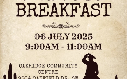 Dust off your boots and join us for a good ol’ fashioned Stampede Breakfast at the Oakridge Community Centre on Sunday, July 6, from 9:00 AM to 11:00 AM at 9504 Oakfield Dr SW, Calgary, AB T2V 0L1 Everyone is welcome — no cost to attend!